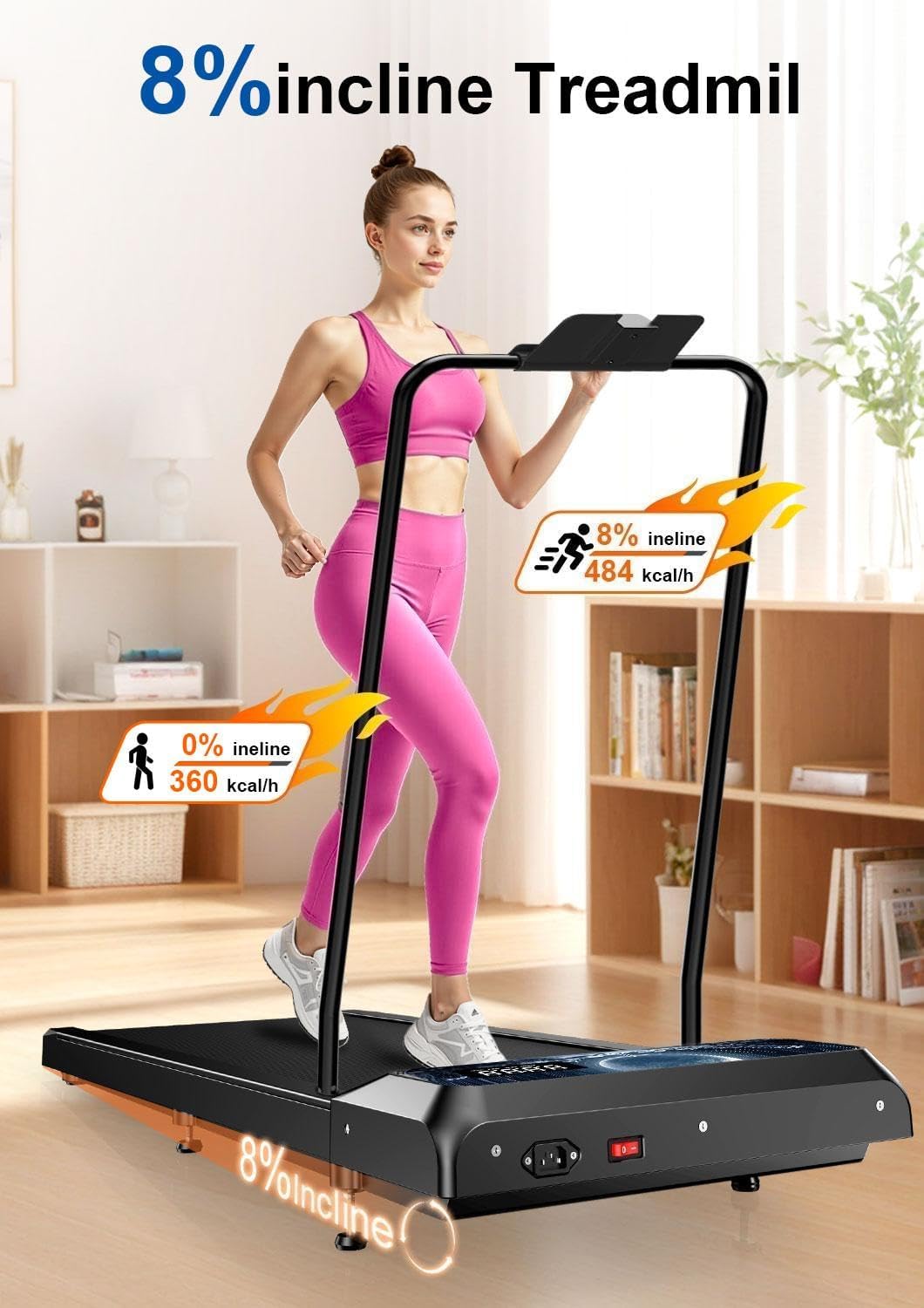 0-8% Incline Treadmill:This treadmill with incline has four manual incline levels (0-3%-5%-8%) that allow you to customize the intensity of your workout and target different fitness goals. Adjust the incline to burn more calories and meet your diverse workout needs