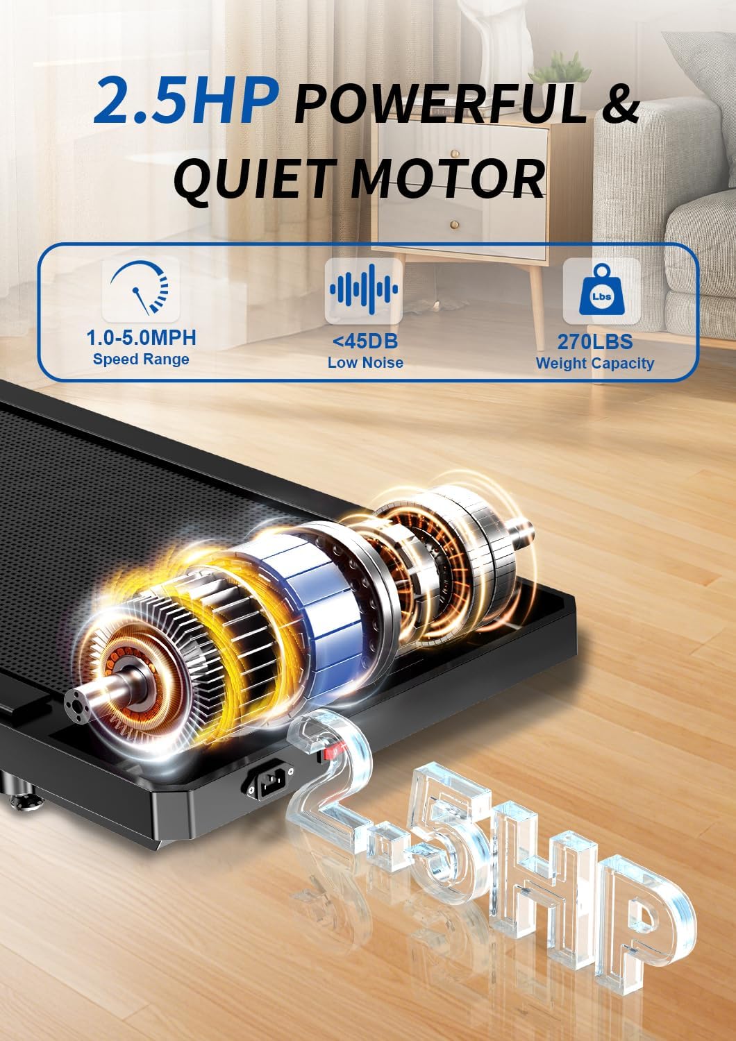 2.5HP Powerful & Quiet Motor: This under desk treadmill is equipped with apowerful 2.5HP motor, supporting a maximum weight capacity of 270lbs.The running treadmill offers speeds ranging from 1.0 to 5.0 mph, all while operating at a low noise level under 45 DB. This ensures a peaceful workout environment without disturbing others, allowing you to focus on your exercise