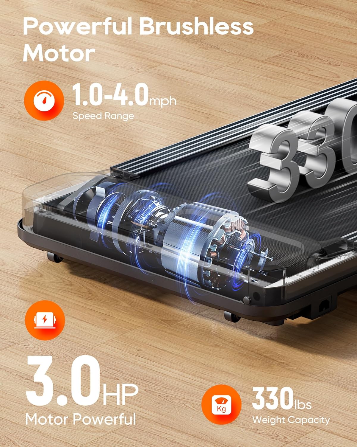 【Powerful Silent Motor】 :This under-desk treadmill boasts a 3.0HP Brushless motor capable of supporting up to 330 lbs. Operating quietly, it’s perfect for home and office settings, You can enjoy your workout without worrying about noise disruptions, whether you’re catching up on emails, watching videos, or participating in virtual meetings.