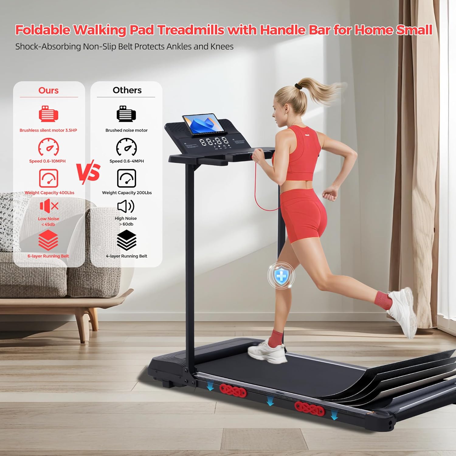 【High-Powered Home Fitness Solution】Engineered for versatile training, this treadmill with handles delivers robust 3.5HP quiet motor with 0.6-10.0MPH speeds. Supporting 400LBS capacity, its space-saving footprint fits compact living spaces. Among premium treadmills for home, it excels in walking, running, and intense cardio while maintaining apartment-friendly operation. Experience seamless power in this folding treadmill for small spaces – professional performance meets residential convenience.
